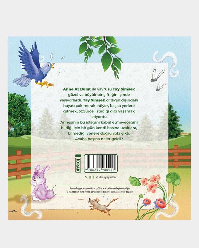 Anne At Bulut ile yavrusu Tay Şimşek güzel ve büyük bir çiftliğin içinde yaşıyorlardı. Tay Şimşek çiftliğin dışındaki hayatı çok merak ediyor, başka yerlere gitmek, özgürce, istediği gibi yaşamak istiyordu. Annesinin bu istediğini kabul etmeyeceğini bildiği için bir gün kendi başına uzaklara, bilmediği yerlere doğru yola çıktı. Acaba başına neler geldi?