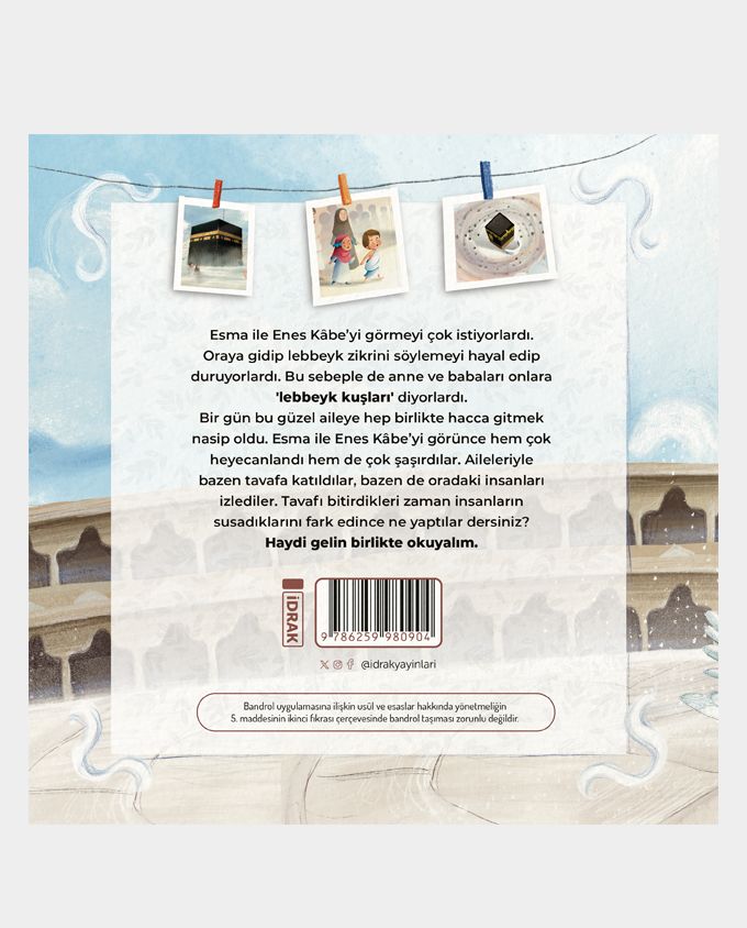 Esma ile Enes Kâbe’yi görmeyi çok istiyorlardı. Oraya gidip lebbeyk zikrini söylemeyi hayal edipduruyorlardı. Bu sebeple de anne ve babaları onlara ‘lebbeyk kuşları’ diyorlardı. Bir gün bu güzel aileye hep birlikte hacca gitmek nasip oldu. Esma ile Enes Kâbe’yi görünce hem çok